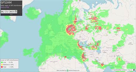 - GPSJAM data are derived from aircraft GPS receivers registering “low accuracy”. Blank areas have insufficient air traffic reporting, e.g. due to closed airspace. It’s likely that GPS signal jamming has been widespread throughout the blank area in and around Ukraine. ↩︎