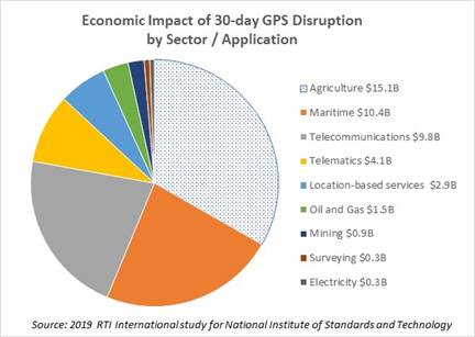A 2019 study commissioned by the National Institute of Standards and Technology (NIST) estimates that a 30-day disruption to GPS could have $15.1 billion economic impact on the agricultural sector were it to occur at a critical time during planting season3, and an additional $30.3 billion of economic impact across all other sectors. Most of these economic impacts are indirect, frictional losses. Outside of agriculture, the maritime sector has the largest estimated impact, primarily driven by delays in port operations.