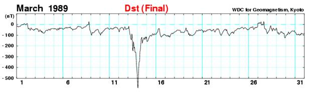 The March 1989 geomagnetic storm is the largest in modern record history, affecting power grids in North America (Quebec in particular) and interrupting control and communications with some satellites. The GPS system was not yet fully operational or open to civilian use, so we have no report of whether or not there was any disruption. It would have been a G5 on SWPC’s scale, and it had a peak Disturbance Storm-Time (Dst) index reading of -589 nanoteslas (nT)5.